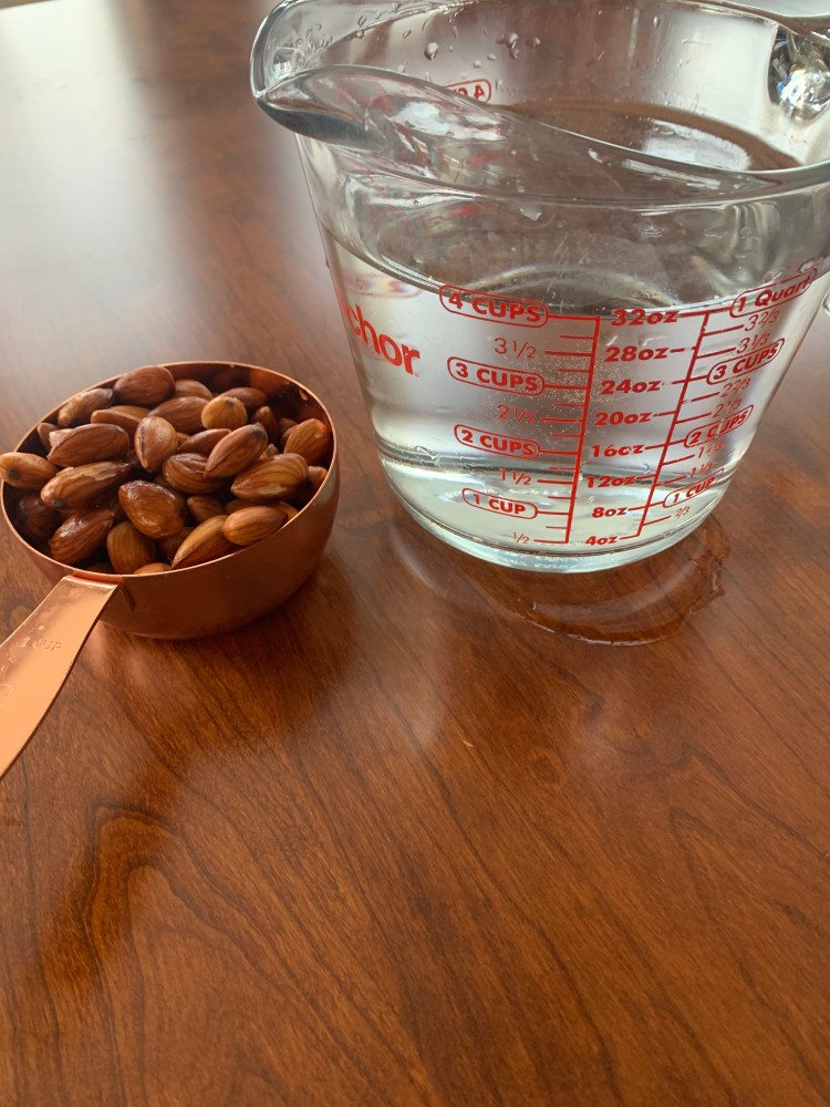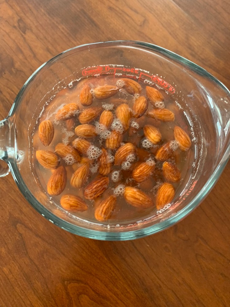 Soak almonds overnight in the fridge in filtered water for at least 3 hours or overnight, I found best results when soaked for about 10 hours.
