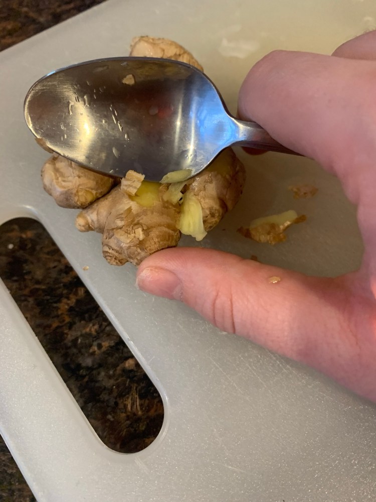 *If you aren’t fond of strong ginger taste, use 1 tbs instead of 2. The easiest way I’ve found to peel ginger is with a spoon. (image below)